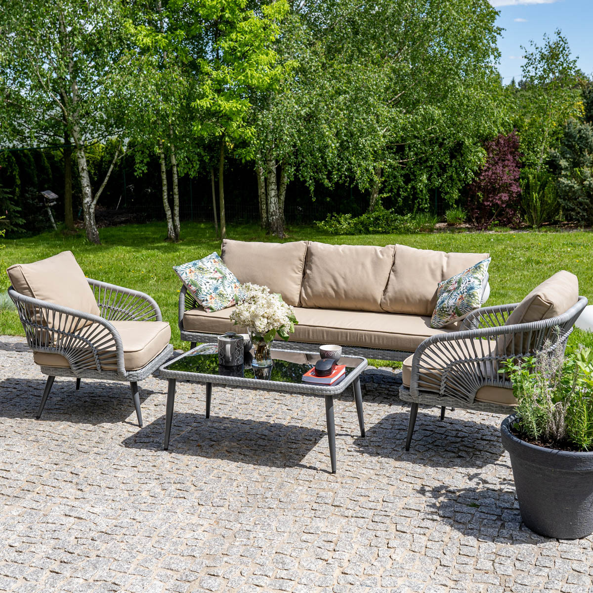 Moderen in privlačen 4-delni vrtni set NOVA vam ponuja dva stola, sedežno in preprosto mizico. Primerna je predvsem za vrt ali teraso na kateri se lahko sprostite, udobno usedete in se naužijete svežega zraka. Nogice so kovinske, sedeži pa iz poliestra in udobne pene.