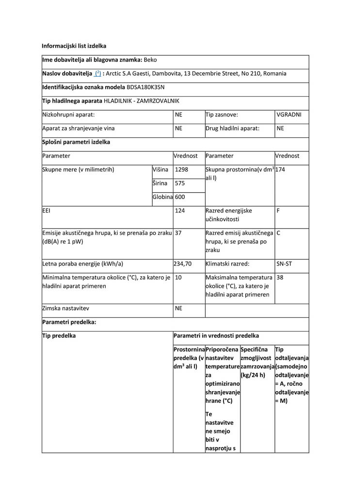 Z vgradnim hladilnikom BDSA180K3SN s 130 litri skupne kapacitete hladilnega dela, 44 litri ločenega zamrzovalnega dela, predalom za sadje in zelenjavo ter tremi steklenimi policami dobite optimalen prostor za shranjevanje živil. Razred E energetske učinkovitosti pa poskrbi za nizko električno porabo.