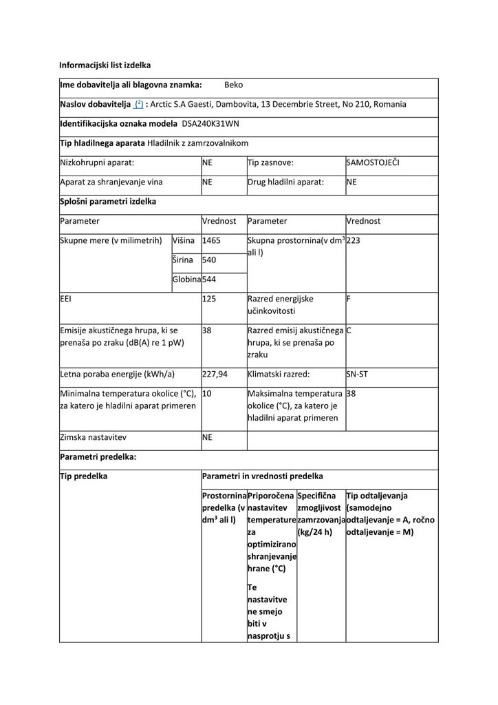 Prostostoječi hladilnik Beko DSA240K31WN z zamrzovalnikom zgoraj se ponaša s štirimi prilagodljivimi steklenimi policami, tremi policami v predelu vrat, predalom za sadje in zelenjavo ter priročnim zamrzovalnikom, zaradi katerih bodo vaša živila skrbno in varno shranjena. Nahaja se v energijskem razredu F, glasnost njegovega delovanja pa znaša 38 dB. Možnost zamenjave strani odpiranja vrat omogoča prilagajanje vsakemu prostoru.