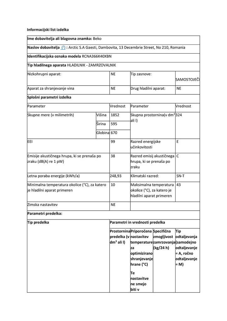 Kombinirani hladilnik Beko RCNA366K40XBN z zamrzovalnikom spodaj navdušuje s tehnologijo NeoFrost, ki pripomore k 2x hitrejšemu hlajenju, tehnologijo No Frost – samodejnim odtaljevanjem in predalom za daljšo svežino, zamrzovalni predel ima 3 prostorne predale. Zaradi posebnih tečajev se vrata odpirajo vzporedno s stransko stranico hladilnika. Možnost zamenjave strani odpiranja vrat omogoča prilagajanje vsakemu prostoru. Kombinirani hladilnik se nahaja v energetskem razredu E, glasnost njegovega delovanja pa znaša 38 dB.