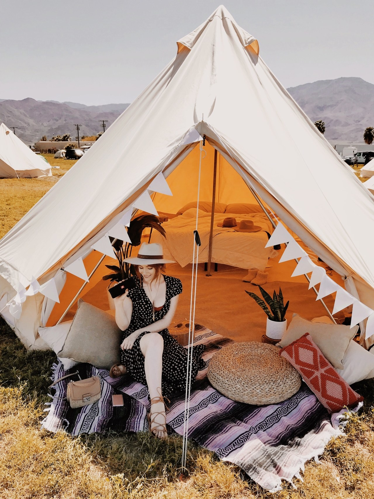First come the music-festival Instas and Snaps, now come the juicy recaps. That’s right, get ready to slow-roll your (virtual) vintage VW Surfari back in time to a desert dreamscape populated by people in really good outfits posing against one equally photogenic ferris wheel. Three influential festivalgoers—who already let us watch them pack—are giving us a retrospective peek into their tents at Base Camp at Indio. Come visit a land where not just the hair and denim but even the mobile batteries and phone accessories inspire us all to live better.