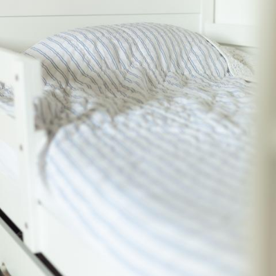 Odlično. Nad njo sta bila in še vedno sta navdušena, saj je čudovita. Težav glede spanja na vrhnjem pogradu ni bilo, saj smo se že od začetka dogovorili, da je zgoraj Timon, saj je starejši. Prav tako Liam ponoči večkrat pride pome, če ima grde sanje in tako kakšno urico prespim kar v pri njem v njegovi postelji. Na začetku sem mislila da bova pretežka, ampak so otroške postelje res konkretne in brez težav se nanjo uleževa oba z dragim.