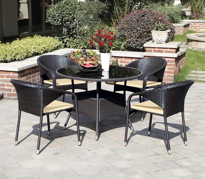 Narejena je iz umetnega ratana in je sestavljena iz 4 stolov z blazinami ter mize. Ima ogrodje, ki je narejeno iz vrhunskega aluminija, vrhnja površina mize pa je narejena iz črnega temperiranega stekla. Izbirate lahko med belo in rjavo barvo.