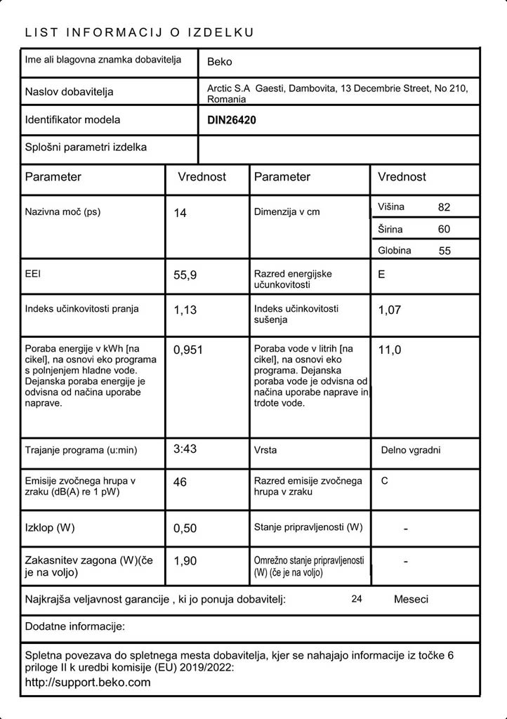 Pomivalni stroj Beko DIN26420 je popolnoma vgradni stroj v razredu E in 6 programi pomivanja. Ima 6 programov pomivanja pri 5-ih temperaturah, med drugim tudi hitri program in polovično pomivanje, programe pa lahko srkajšate tudi z funkcijo Fast+. Proigram Steam gloss je odličen za pomivanje kozarcev. Omogča pomovanje polovičnega polnjenja in zamik vklopa za 24 ur. Zaradi svoje odlično zasnovane košarte omogoča tudi pomivanje pladnjev. Ima tudi samočistilni program, s katerim bo vedno nudil optimalne rezultate pomivanja.