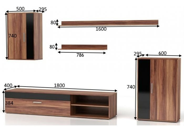 Ta sklop je narejen iz oplemenitene iverne plošče in kombinacije barv sliva in črni sijaj. Sklop pohištva je sestavljen iz omare, TV mize, stenske omarice in dveh polic. Prodaja se samo v kompletu.