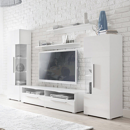Dnevna soba Coco preprostih modernih linij bele barve z vrati v beli barvi visokega sijaja. Funkcionalen dizajn dopolnjujeta 2 stekleni vitrini. Skupaj s kvalitetno izdelavo pa je zadovoljstvo garantirano.