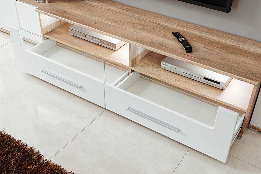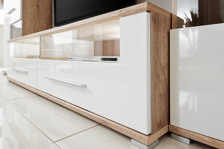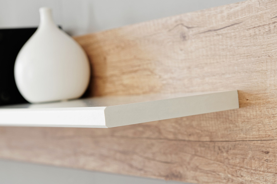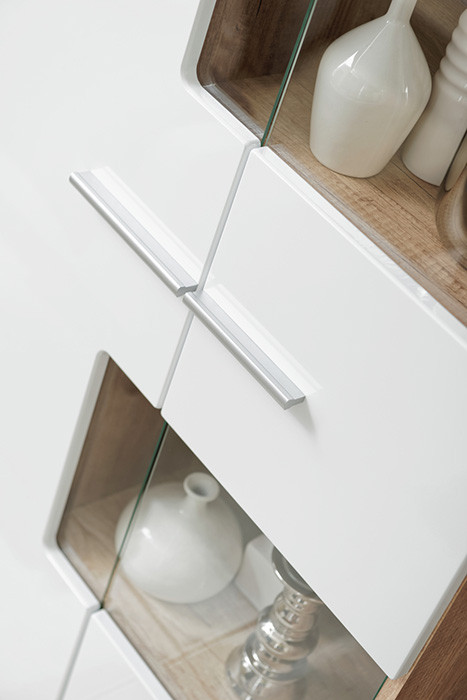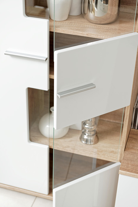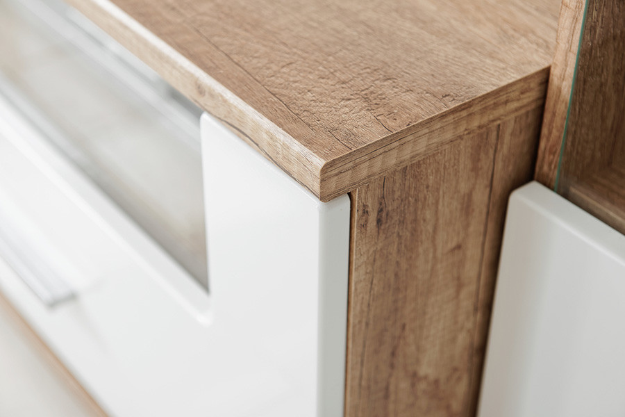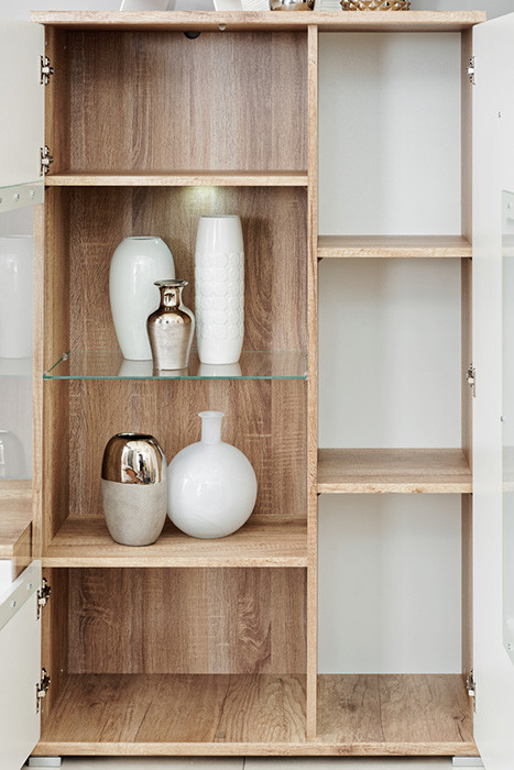 Dnevna soba SAALA 3 je regal v kombinaciji hrasta in bele barve. Sestavljena je iz 2 vitrin, police in TV omarice. Fronte so narejene iz MDF materiala 16 mm, korpus je narejen iz oplemenitene iverne plošče 16 mm. Dnevna soba je z osvetlitvijo.