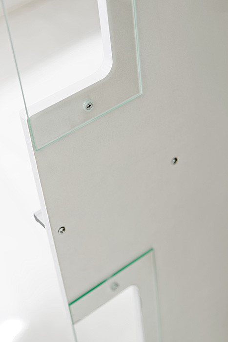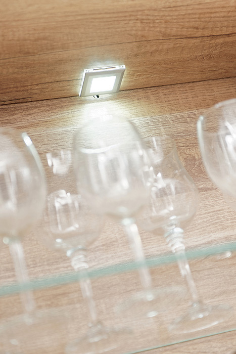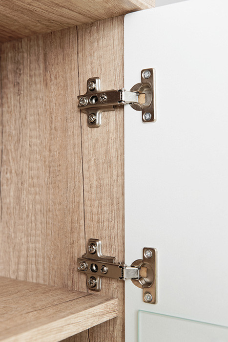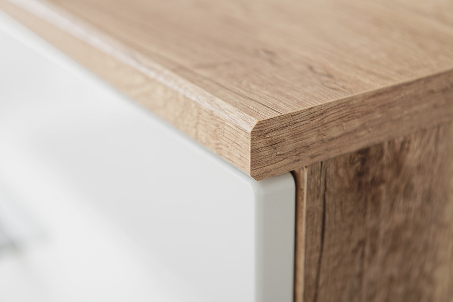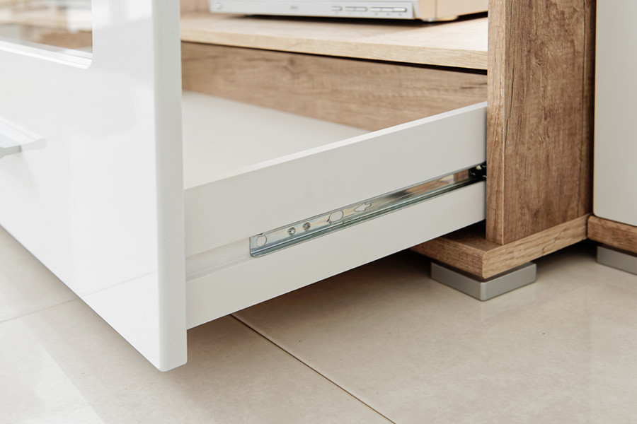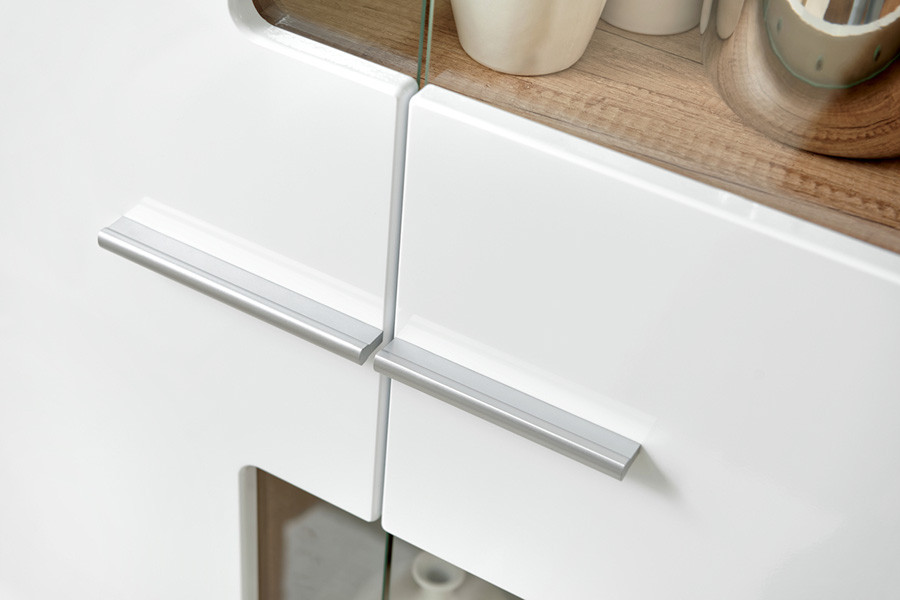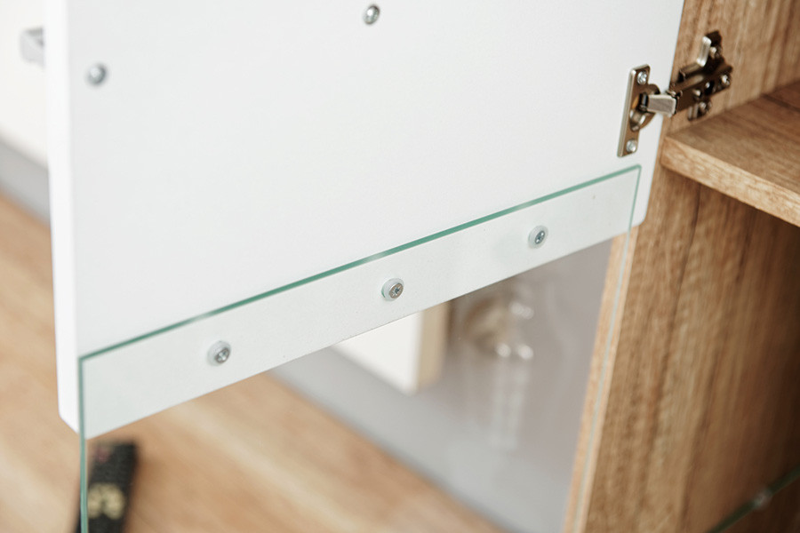 Dnevna soba SAALA 3 je regal v kombinaciji hrasta in bele barve. Sestavljena je iz 2 vitrin, police in TV omarice. Fronte so narejene iz MDF materiala 16 mm, korpus je narejen iz oplemenitene iverne plošče 16 mm. Dnevna soba je z osvetlitvijo.