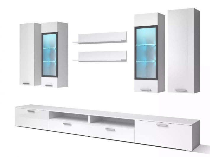 Dnevna soba Sarah vam bo nudila več kot dovolj prostora za vse vaše stvari in poskrbela, da bodo urejeno pospravljene. Pri stenskih omaricah s steklom pa boste lahko imeli vaze in druge dodatke stilsko razstavljene na ogled.Dodatno lahko naročite tudi RGB LED osvetlitev z možnostjo nastavitve barve svetlobe, ki bo zagotovo popestrila vzdušje v prostoru. Dnevna soba je na voljo v malem (210 cm) in velikem setu (280 cm).