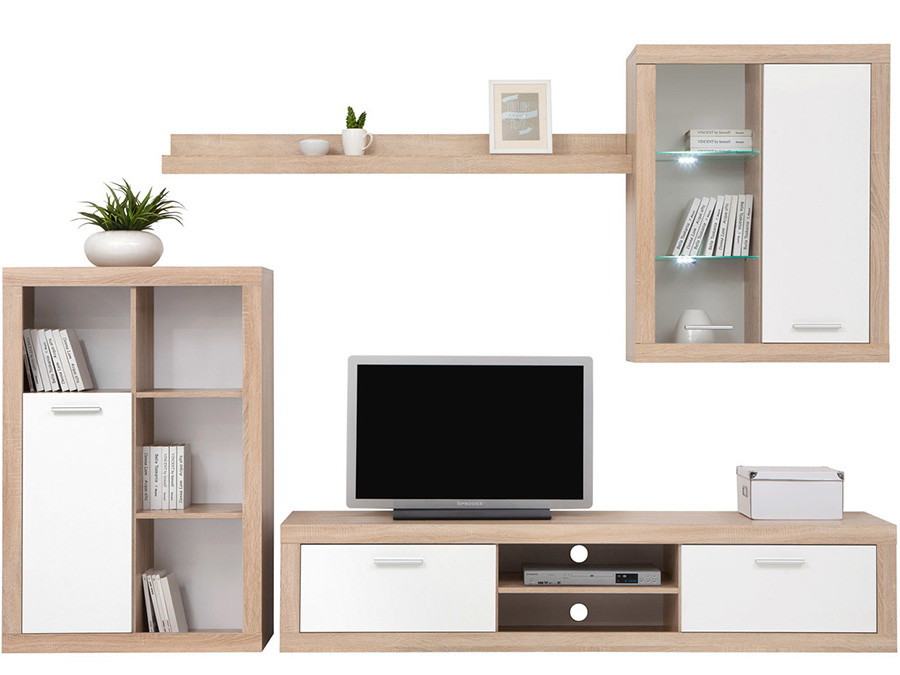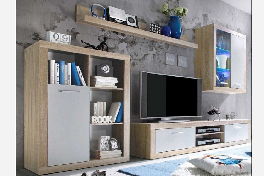 Ta kompakten set pohištva je narejen iz kvalitetnih materialov. Fronte so narejene iz oplemenitene iverne plošče. Set je narejen v kombinaciji barv, bela in sonoma hrast. Komplet vsebuje vitrino, TV mizo, omaro in stensko polico. Prodaja se samo v kompletu.
