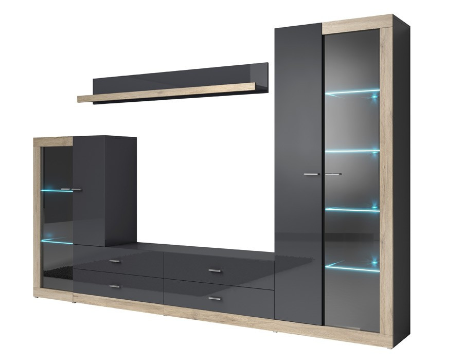 Dnevna soba Tessa J10 vas bo navdušila s svojim edinstvenim dizajnom. Kombinacija stekla ter san remo in antracit barve, visokega sijaja bosta v vaš dom vnesli pridih moderne elegance. Privoščite si edinstveni stil in uživajte v luksuzni dnevni sobi.