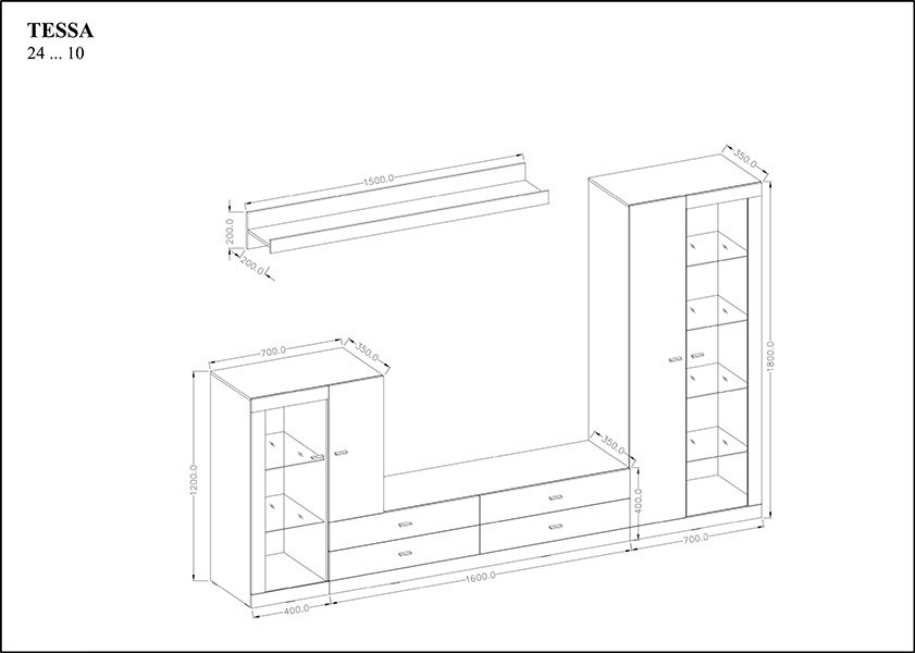 Dnevna soba Tessa J10 vam bo nudila več kot dovolj prostora za vse vaše stvari. S steklenimi policami boste imeli knjige, vaze in druge dodatke stilsko razstavljene na ogled. Kot dodatek vam je na voljo tudi ekonomična LED osvetlitev v modri ali beli barvi, ki bo zagotovo popestrila vzdušje v prostoru. Poleg dnevnega sestava lahko naročite tudi komodo Tessa in s tem pridobite dodatni funkcionalni element za shranjevanje.