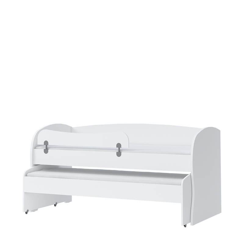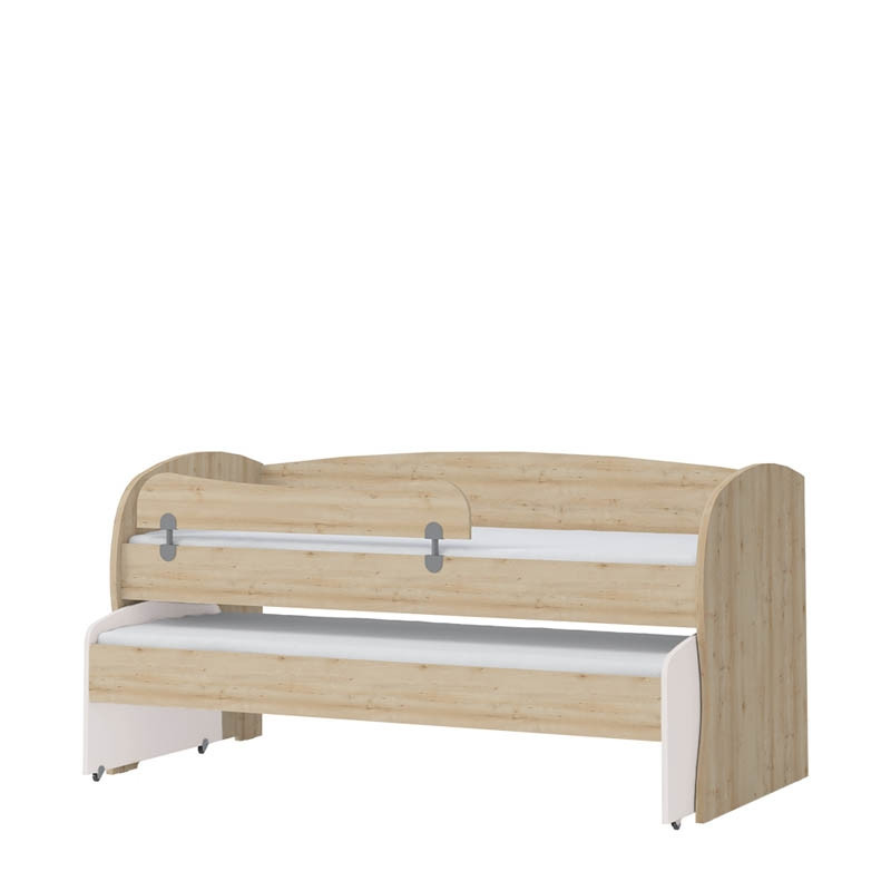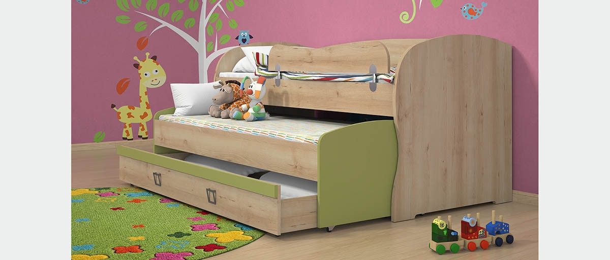 Dvojna postelja KIKI je izjemno praktična saj lahko vsebuje kar tri ležišča! Postelja maksimalno izkoristi vsak delček zavzetega prostora zato je odlična izbira za otroške sobe, kjer primanjkuje prostora. Postelja ima dve ležišči, zgornje je primerno za vzmetnico velikosti 90x200 cm, spodnje pa za velikost 80x190cm. Z nakupom posteljnega predalnika KIKI FK80 lahko postelji dodate še tretje, občasno ležišče, ki bo odlično dodatno ležišče za goste. Za posteljo je primeren tudi predalnik KIKI FK68, kamor lahko pospravite posteljnino, igrače in druge poljubne predmete.