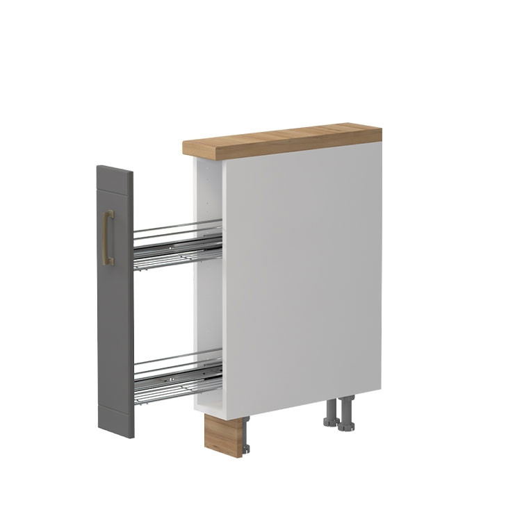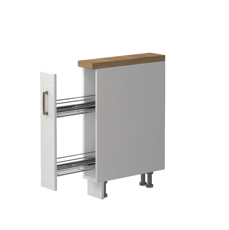 Element ima izvlečna vratca z dvema policama, na katera lahko postavite olje, kis in razne začimbe. Ima funkcijo tihega zapiranja, ki pripomore k lažji vsakodnevni uporabi. Na voljo je v elegantni beli in grafit barvi in v klasičnem dizajnu, ki je vedno moderen in izgleda odlično v vsakem domu.