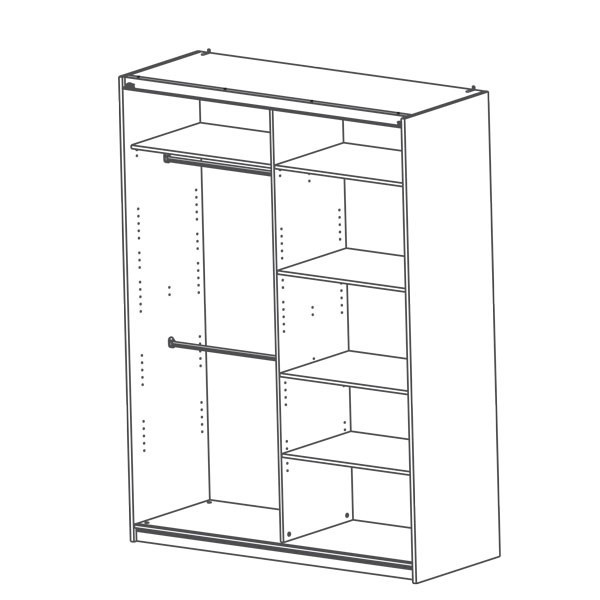 Garderobna omara FAST 120 je 2 delna garderobna omara z drsnimi vrati. V notranjosti je na vrhu po celotni širini polica. Na voljo so še tri police in ena obešalna palica polovične širine, ki jih lahko namestite poljubno.