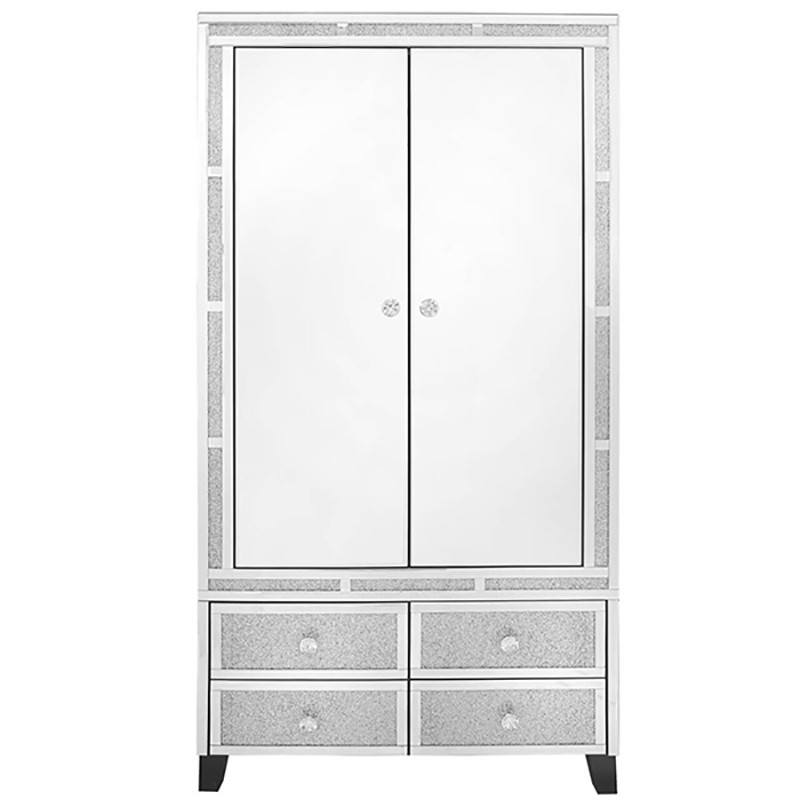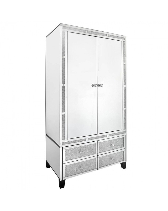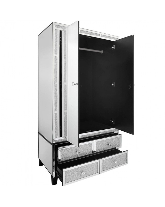 Opremite svojo spalnico s prestižno garderobno omaro GLAMMY GLAM, ki je izdelana iz kvalitetnega MDF materiala in obdana z ogledali. Omara ima v zgornjem delu palico za obešanje, v spodnjem pa štiri predale, v katere lahko pospravite majice, pižame, nogavice, in ostala oblačila. Omara je že sestavljena in takoj pripravljena za uporabo!
