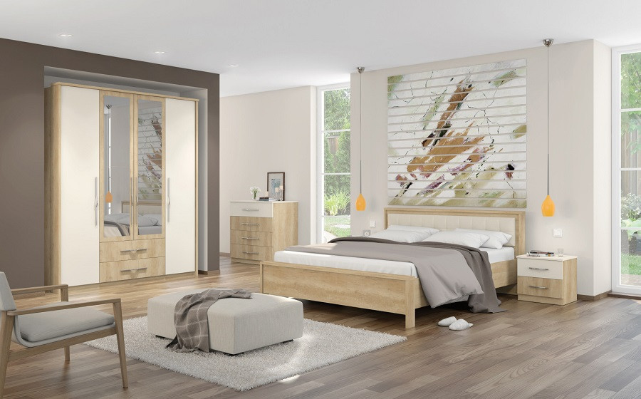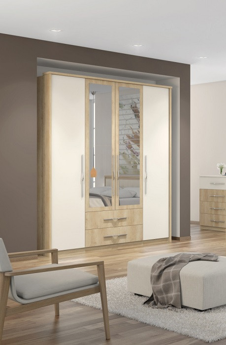 Garderobna omara je sestavljena iz štirih vrat in dveh predalov. Notranjost garderobne omare ima 3 police - oplemenitene iverna plošča in 3 palice za obešanje oblačil. Garderobna omara ima tudi tiho zapiranje. Z garderobno omaro boste prihranili prostor v vaši spalnici. Pustite, da polepša vaš dom in spalnico.