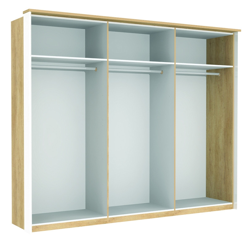 Garderobna omara Kalla Comfort z drsnimi vrati je nepogrešljiv element vsake spalnice, saj je izjemno funkcionalna. Z dodatno opremo si lahko ustvarite še bolj funkcionalno omaro, ki je prilagojena vašim potrebam. Na voljo je v barvni kombinaciji bež in nebraska hrast. Notranjost vključuje tri velike police in tri dolge palice za obešanje.