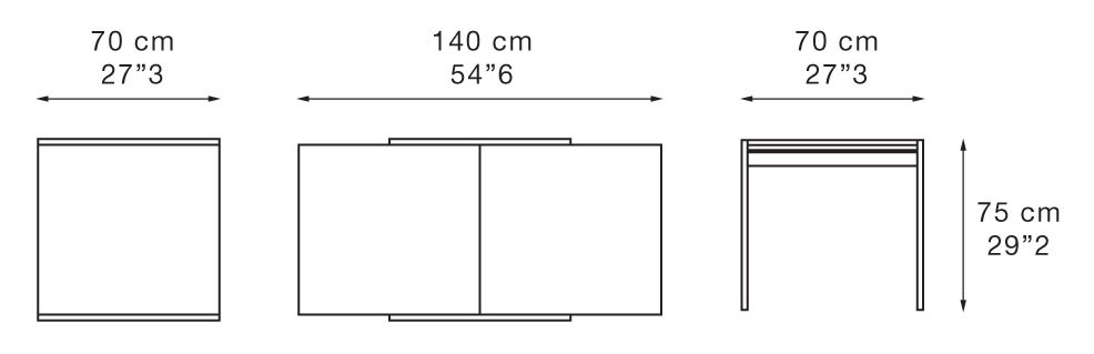 Dimenzije jedilne mize Dado 70: Š: 70 cm; D: 70/140(raztegnjena) cm; V: 75 cm