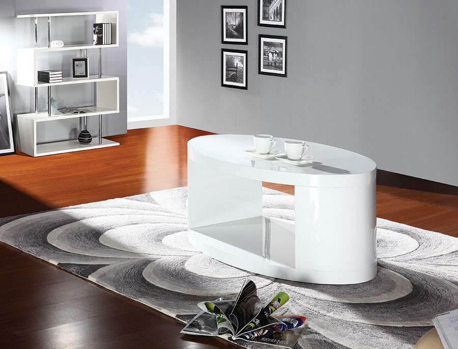 Klubska miza TINKARA je moderna klubska miza ovalne oblike v beli barvi visokega sijaja. Primerna je za vsako dnevno sobo.