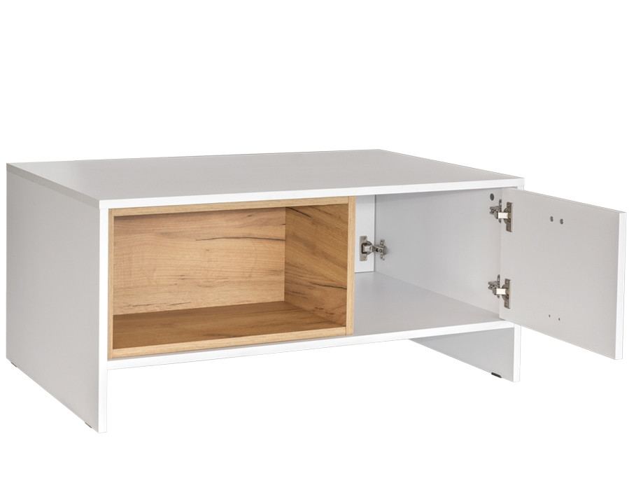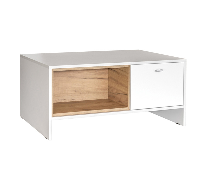 Moderna klubska mizica KARINA ima manjšo omarico, ki se odpira iz obeh strani in v katero lahko pospravite razne malenkosti, ter tako ohranite bolj čisto in organizirano dnevno sobo. Na poličko pa lahko odložite razne revije, časopise in knjige za goste. Na voljo je v kombinaciji elegantne bele barve in zlatega hrasta, ki se z lahkoto kombinirata z ostalimi barvami v vaši dnevni sobi!