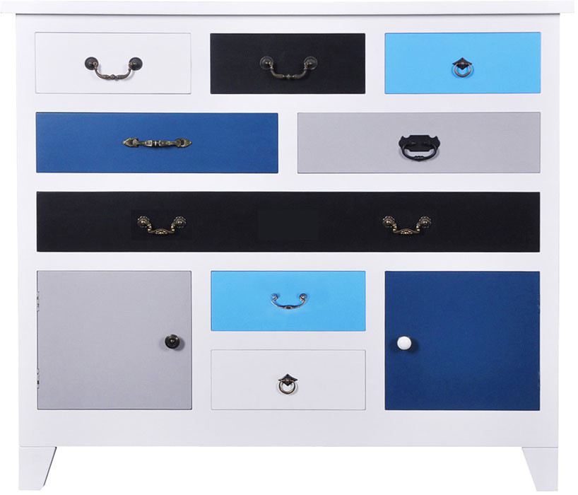 Komoda BLUE 8 je stilska in eleganta komoda. S svojo funkcionalnostjo in dizajnom bo v središču vašega bivalnega prostora. Idealna je za opremo mladega in modernega stanovanja. Moderna komoda je narejena iz trdnega lesa. Njene fronte so pisane in ima 8 predalov in 2 vrata. Maximalna obremenitev je 66 kg.