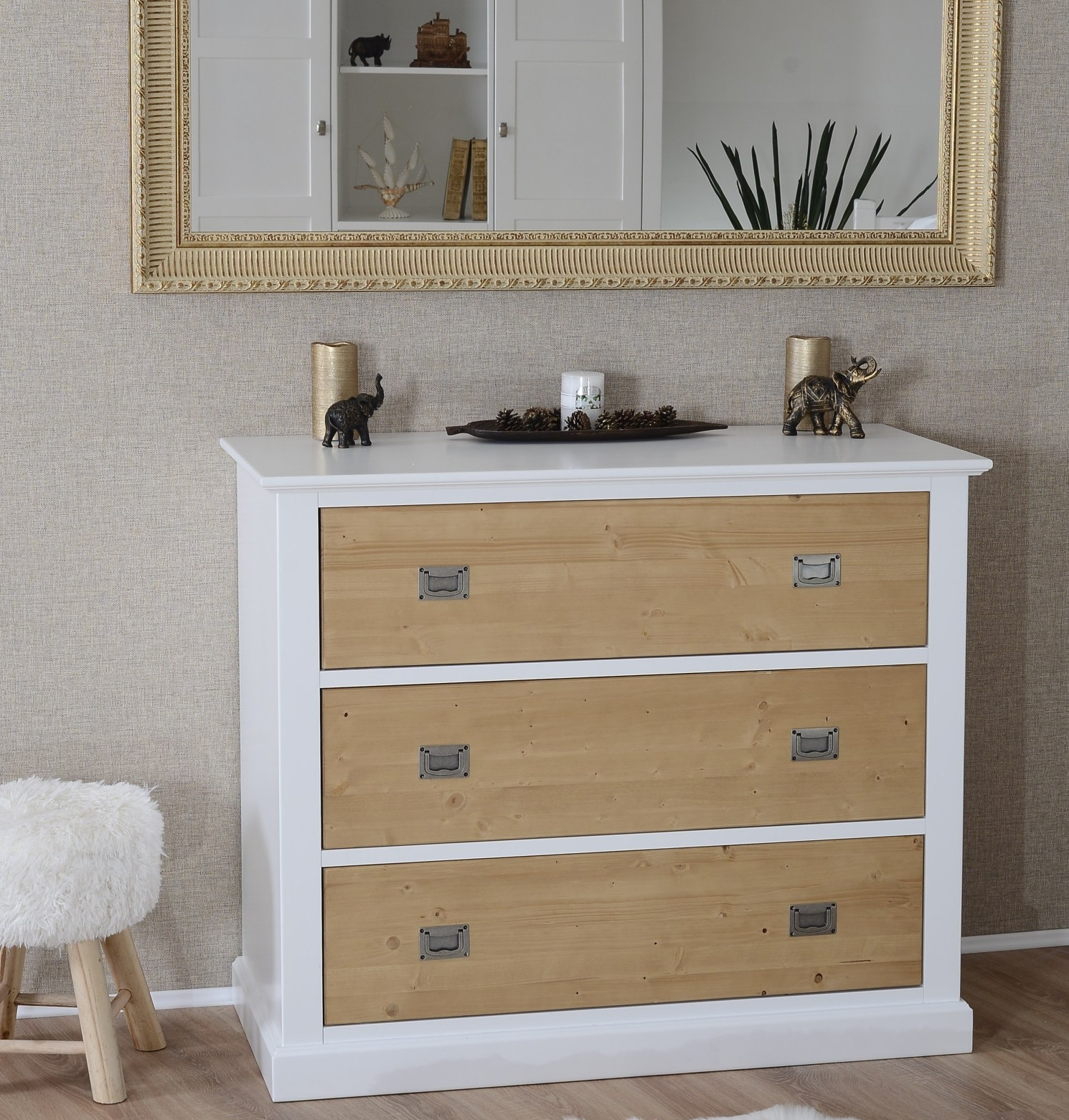 Vsestransko uporabna masivna komoda CALM je na voljo v kombinaciji bele in natur barve, ki se odlično poda v vsak prostor in ga naredi bolj funkcionalnega. Vsebuje tri prostorne predale, ki vam omogočajo shranjevanje različnih predmetov, zato bo vaše stanovanje vedno lepo pospravljeno in organizirano! Predali imajo funkcijo tihega zapiranja, ki omogoča lažjo vsakodnevno uporabo in preprečuje nastajanje poškodb, zato bo komoda dlje časa ostala lepo ohranjena!