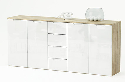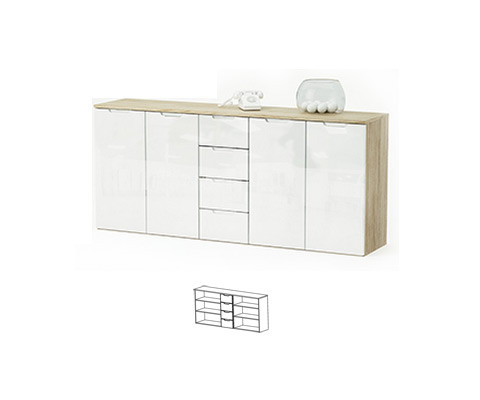 Komoda CLIO 170409 je velika komoda s štirimi predali in štirimi vrati. Komoda modernega izgleda je v natur barvi s sprednjo stranjo v beli barvi visokega sijaja.