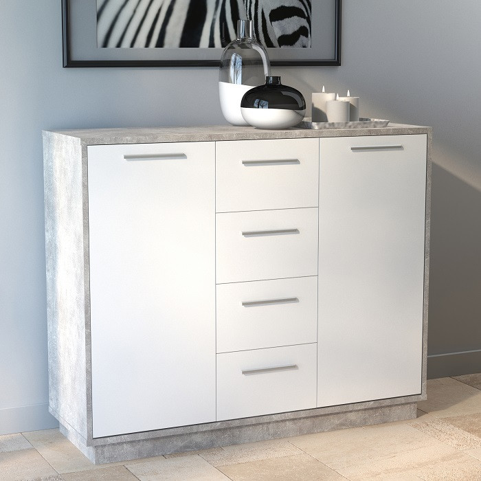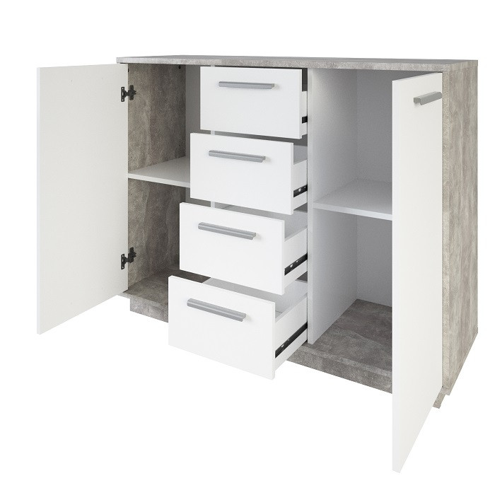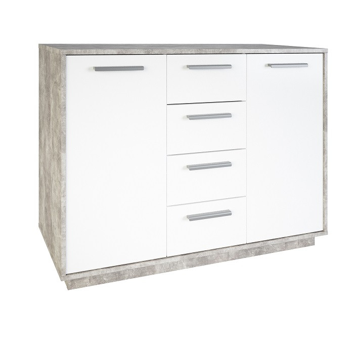 Komoda LOGAN 309105 je komoda v kombinaciji bele barve in imitacije cementa. Na vsaki strani ima vrata in v notranjosti polico, ki jo lahko nastavite na tri različne višine, na sredini ima štiri predale. Oglejte si še ostale elemente iz programa LOGAN.