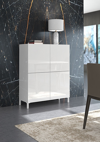 Komoda ima 4 vratca, za katerimi se skrivajo skupno 3 police, na katere lahko odložite raznorazne predmete. Maksimalna nosilnost posamezne police je 5 kg. Spodnja vratca imajo odpiranje na dotik. Komoda ima 5 nastavljivih nogic.