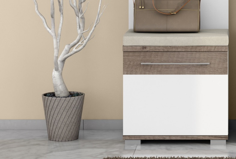 Komoda je narejena iz oplemenitene iverne plošče (18 mm) v beli barvi. Leseni dodatki so v temni nebraska barvi. Na vrhu komode je udoben oblazinjen sedež. Vrata imajo tiho zapiranje. Robovi so ABS (mehki robovi).
