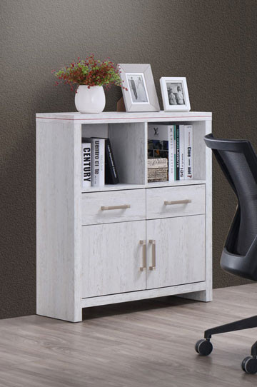 Komoda Nice 3 iz beljenega javora. Ima Dve polici, dva predala in dvoja vrata in se odlično prilaga v vsak dom.