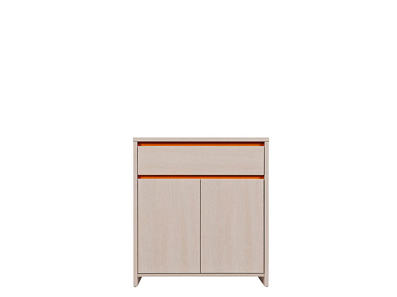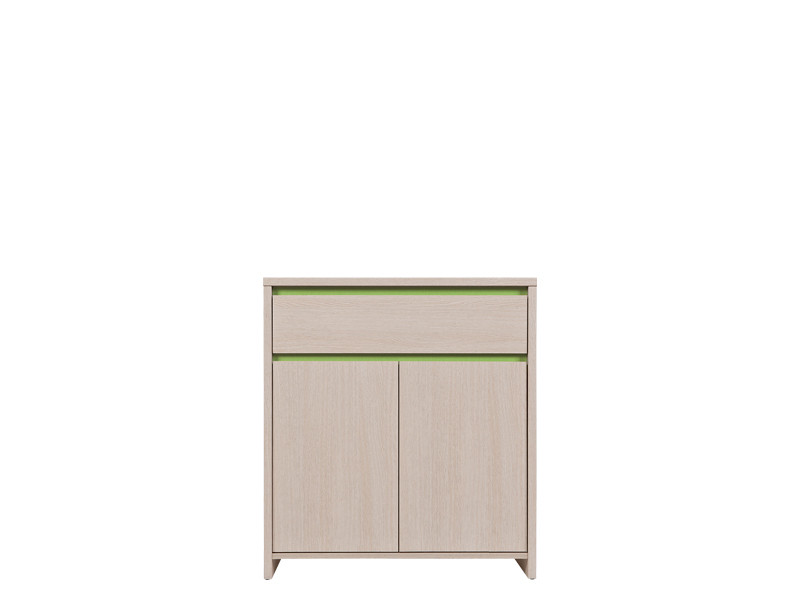 Komoda NUMLOCK je na voljo v dveh barvnih kombinacijah. Sonoma hrast je v kombinaciji z zeleno in oranžno barvo. Komoda je narejena iz oplemenitene iverne plošče.