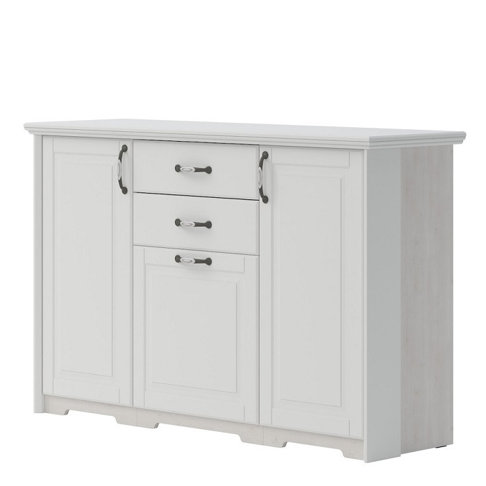 Okvir komode je narejen iz oplemenitene iverne plošče (18 mm) v barvi polarnega bora. Sprednje stranice so narejene iz MDF materiala prekrite z mat folijo, v barvi slonova kost. Komoda ima troja vrata in dva predala.