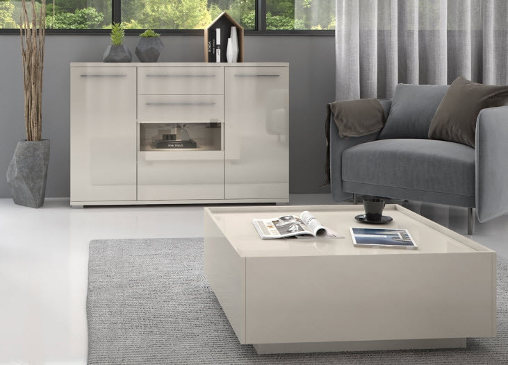 Vsi artikli linije dnevnih sob Radda Piano so premazani z UV lakom, ki je 4-krat bolj odporen na poškodbe in praske kot drugi laki. UV lak omogoči pohištvu visoki sijaj, ki v vaš dom prinese več svetlobe, saj se ta odbija s pohištva in tako ustvari svetlejši prostor. Topla bež barva v visokem sijaju v vaš dom prinese več elegance in moderni slog.