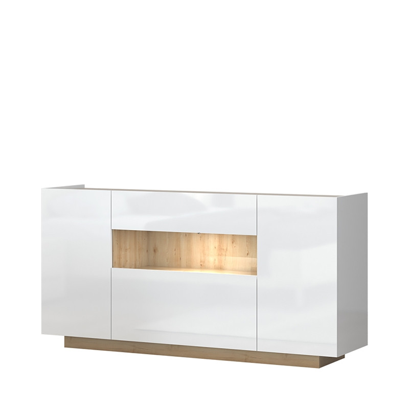 Komoda je zelo prostorna, saj vsebuje prostoren predal na vrhu omare, odprto polico kamor lahko postavite razne slike, knjige in dekorativne izdelke, katere želite imeti s pomočjo LED osvetlitve bolj izpostavljene, ter troje vratc. Za stranskimi vratci sta na vsaki strani še dve polici. Srednja vratca je odpirajo navzdol. Natančna organizacija komoda vam omogoča dobro oranizacijo vaših dragocenosti.