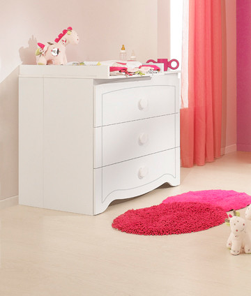 Komoda s previjalno mizo Claire de Lune, dimenzije 95x96x77 cm je narejena iz najboljše kakovosti po mednarodnih standardih, in sicer iz oplemenitene iverne plošče E1 kakovosti. Previjalna mizica je montirana na komodo in se lahko odstrani. Določeni deli so masivni, na izpostavljenih delih pohištva pa ima ABS robove.