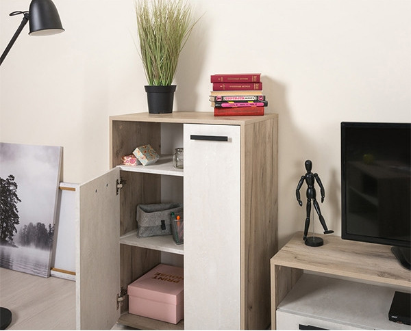Komoda SILVIE 1 bo zagotovo popestrila vaš dom. Moderna komoda v kombinaciji bele barve in hrasta ima dve različno veliki omarici, ki se odpirata s stilskim, kovinskim ročajem. Obe omarici imata eno polico, kateri lahko prilagodite višino za maksimalen izkoristek prostora! Zaradi njenega univerzalnega in modernega izgleda jo lahko uporabite v vseh sobah vašega doma.