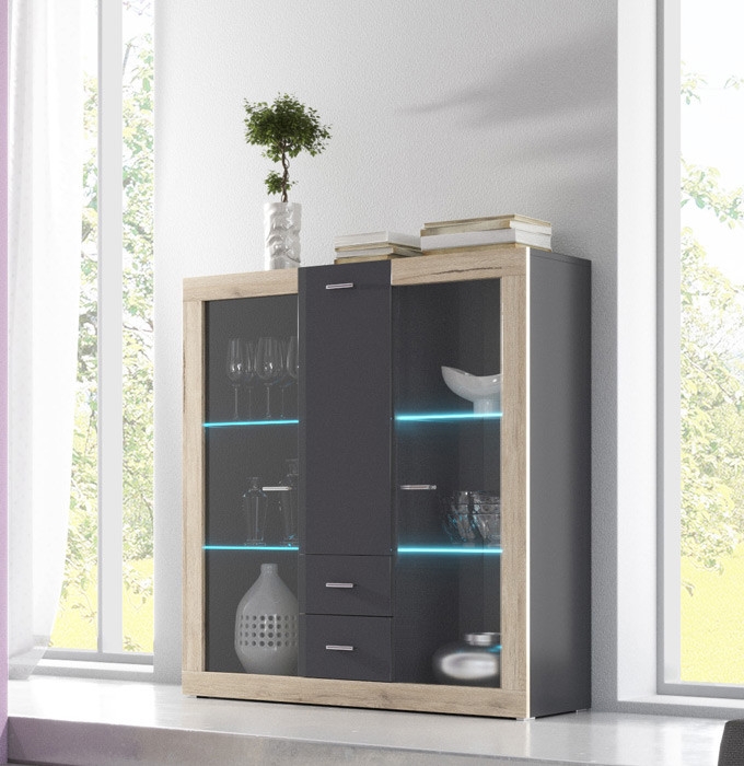 Komoda Tessa 46 je izdelana iz iverne plošče oplemenitene z melaminsko folijo. Visoko kvaliteten in trpežen materijal je na voljo v antracit barvi visokega sijaja, ki se bo odlično podala v vsak prostor. Dobra in kakovostna izdelava zagotavljata dolgo življenjsko dobo pohištva. Kot dodatek pa je na voljo tudi ekonomična LED osvetlitev v modri ali beli barvi, ki bo zagotovo popestrila vzdušje v prostoru.