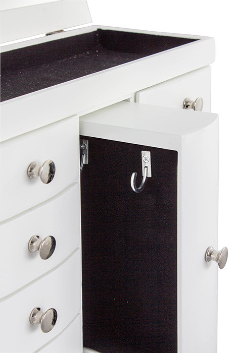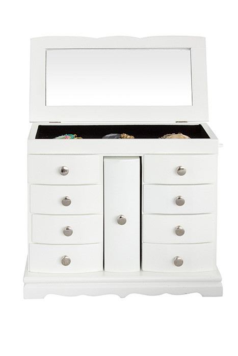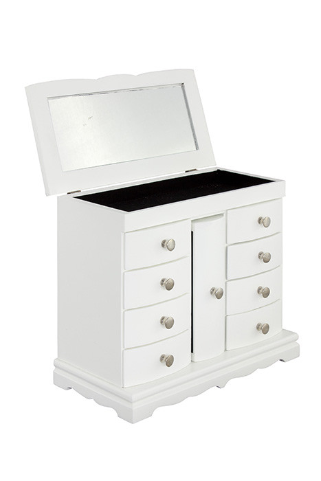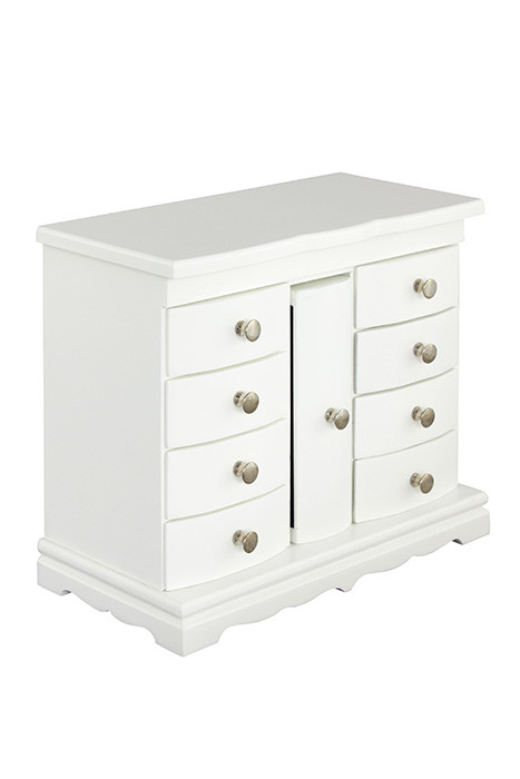 Komoda za nakit DEA v beli barvi je idealno mesto za shranjevanje vašega nakita ter ličil in je obvezen dodatek v vaši spalnici. Komoda ima 9 praktični predalov in vaš nakit bo vedno na svojem mestu. S časom se nabere veliko dragih in malo manj dragih drobnarij, oziroma vašega nakita. Uhani, verižice, ure, zapestnice in še bi lahko naštevali. S to komodo vam bo nakit vedno pri roki in kar je najpomembnejše, vedno bo urejen.