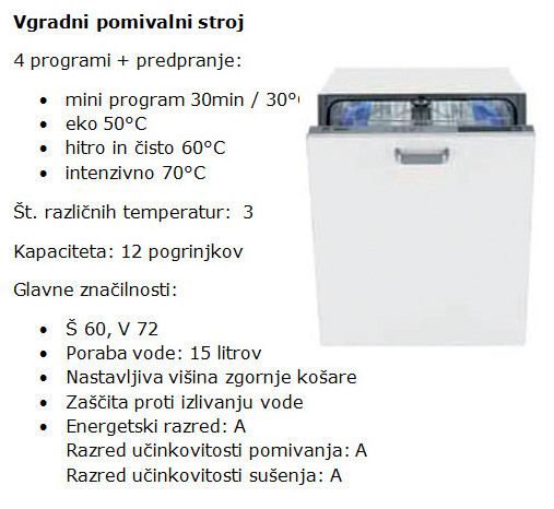 Lastnosti posameznih aparatov bele tehnike so podrobneje opisane v slikah, razen pomivalnega korita 79x50, ki je sestavljeno iz nerjavečega jekla in je možno z levo postavitvijo ter samostoječe kuhinjske nape VEGA, Š 90 cm.