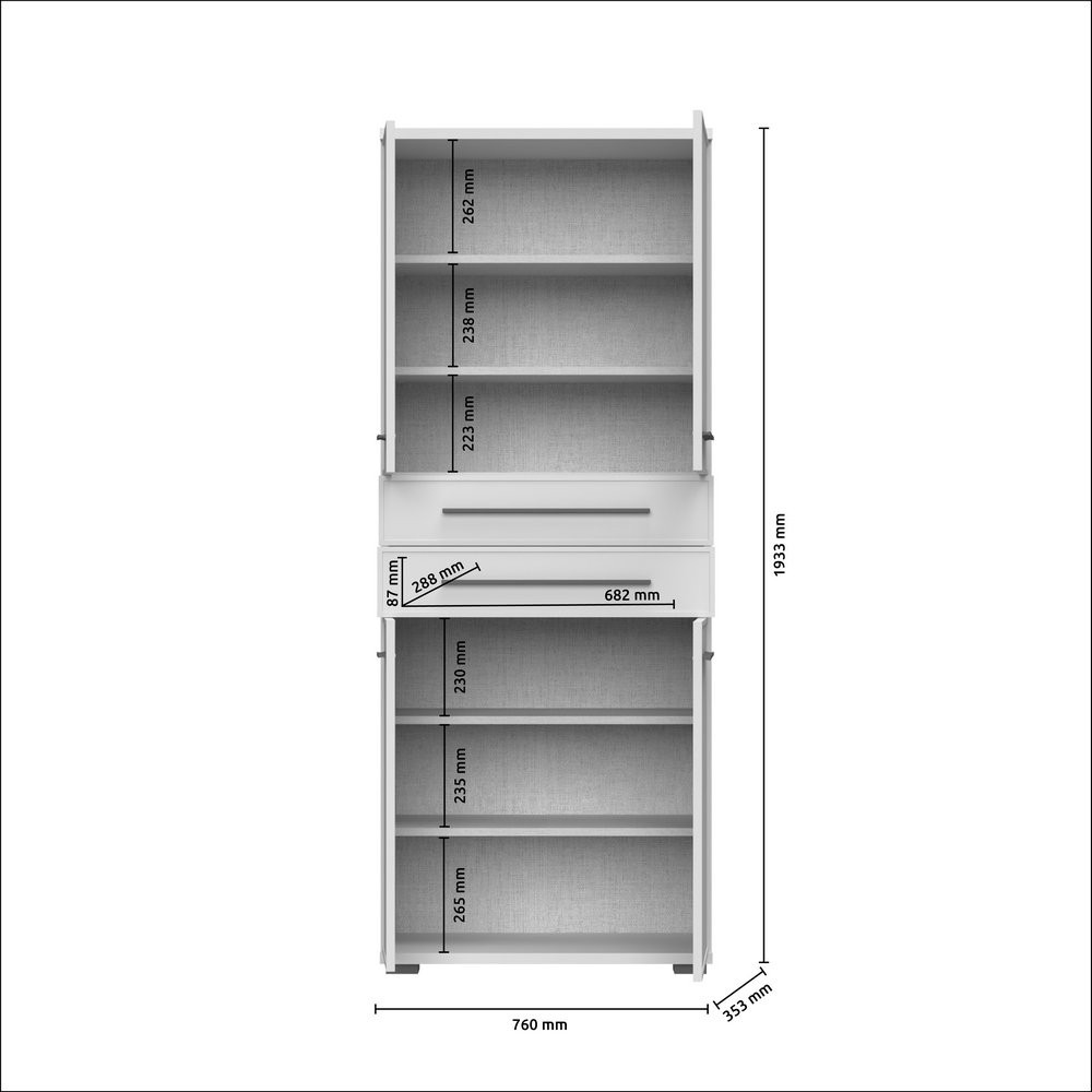 • Vsebuje dva predala in dve polici za učinkovito organizacijo obutve