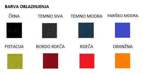 Barve: črna, temno siva, temno modra. pariško modra, pistacija, bordo rdeča, rdeča, oranžna