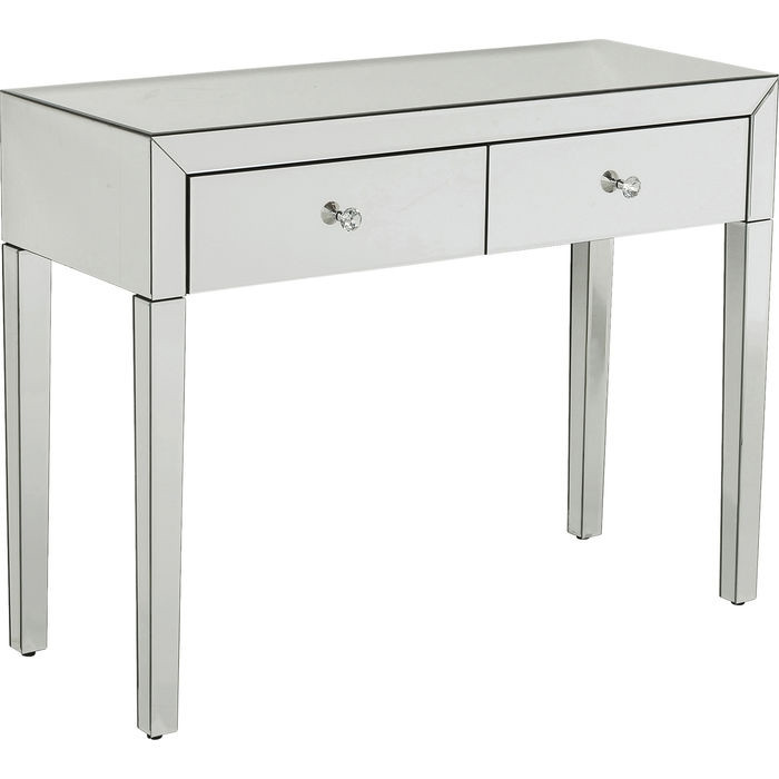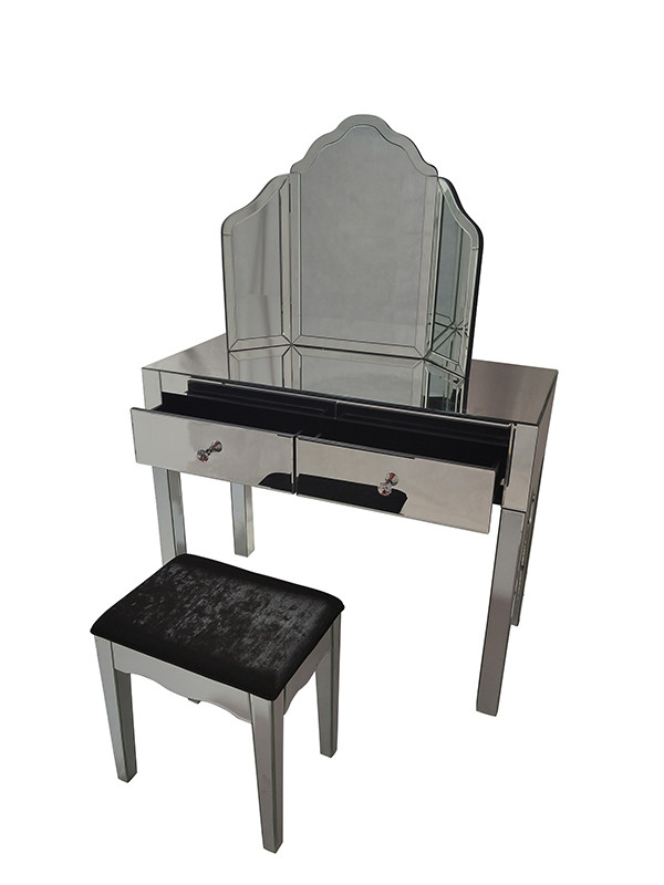 Prestižna kozmetična mizica ROSEN GLAM je sestavljena iz treh delov-mizice z dvema predaloma, elegantnega ogledala ter udobnega oblazinjenega stola. Predala na mizici imata funkcijo tihega zapiranja, ki vam omogoča lažjo uporabo ter preprečuje nastanek prask in poškodb. Mizica je izdelana iz kvalitetnega MDF materiala, ki je oblečen v steklo s srebrnmi poudarki.