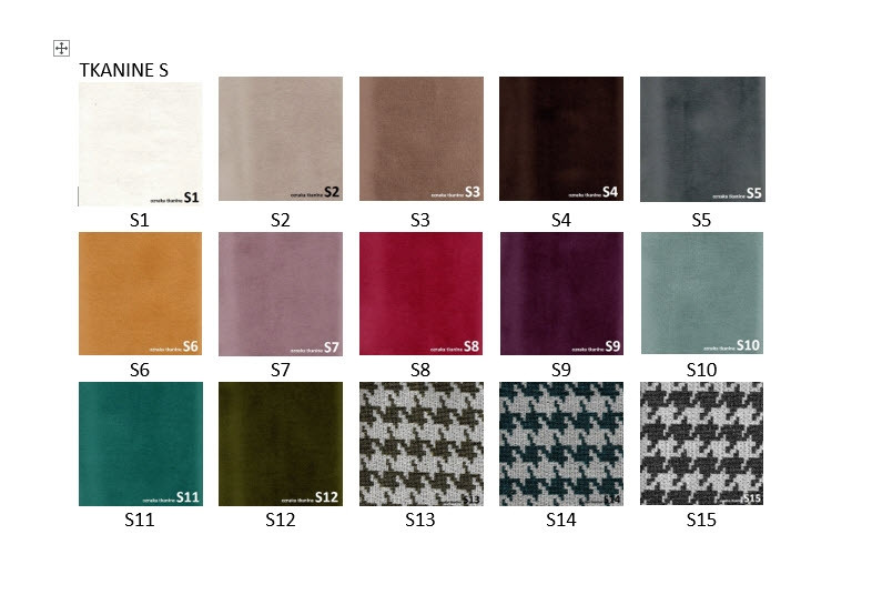 Vse sedežne garniture so izdelane iz izjemno trpežne tkanine, ki je na voljo v kar 80-ih različnih barvah med katerimi lahko prosto izbirate in si tako ustvarite unikatno sedežno garnituro. Tkanina bo ostala popolnoma ohranjena vsaj 15 let. Priporočamo vam tkanino POLO (S60-65 in S68-71), ki ima vse prednosti tkanine in izgleda kot usnje.