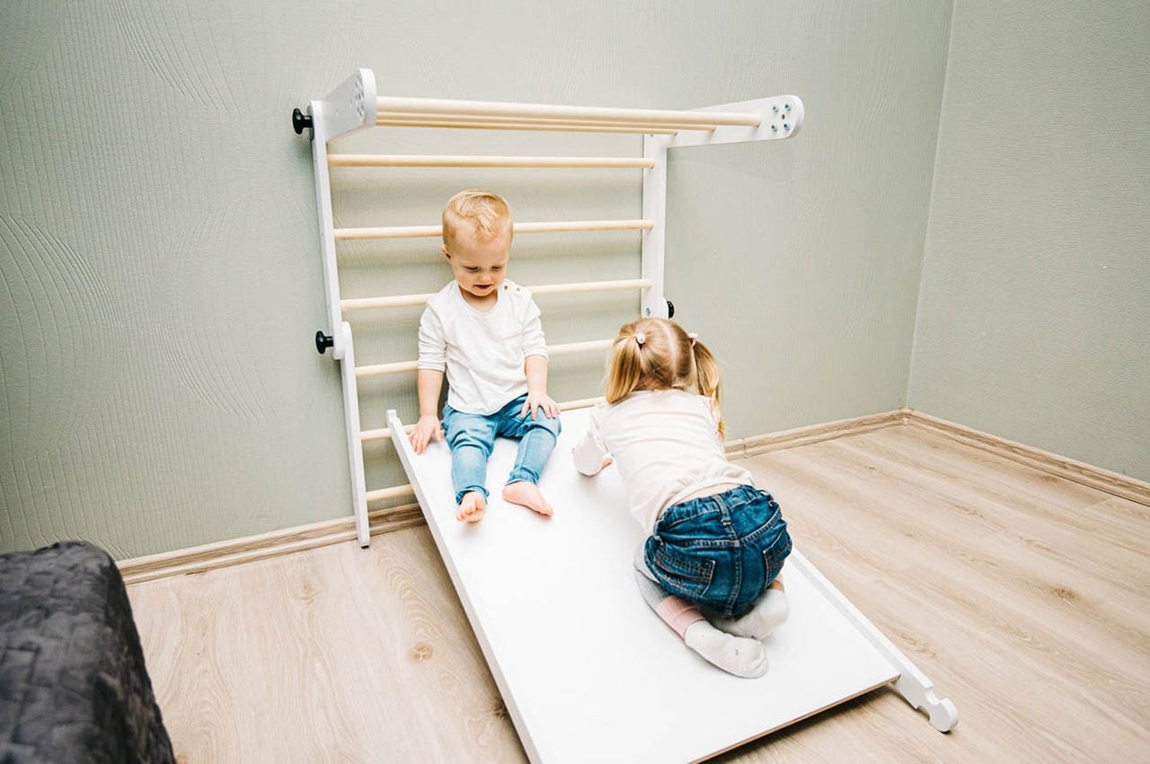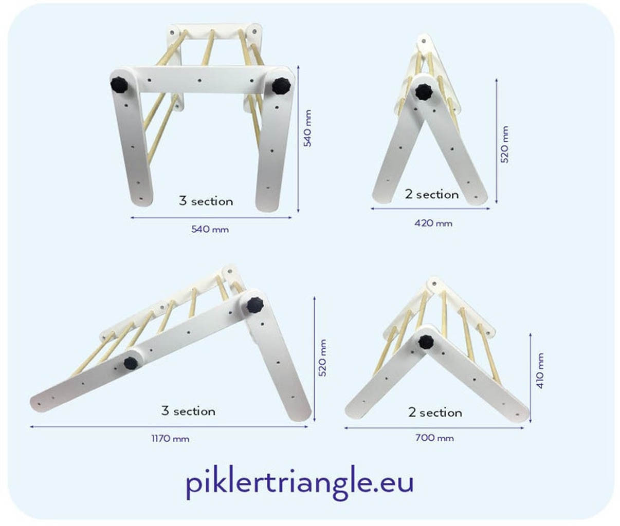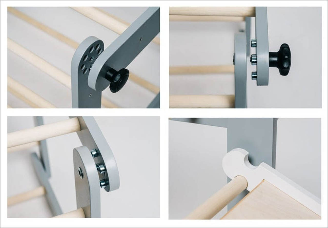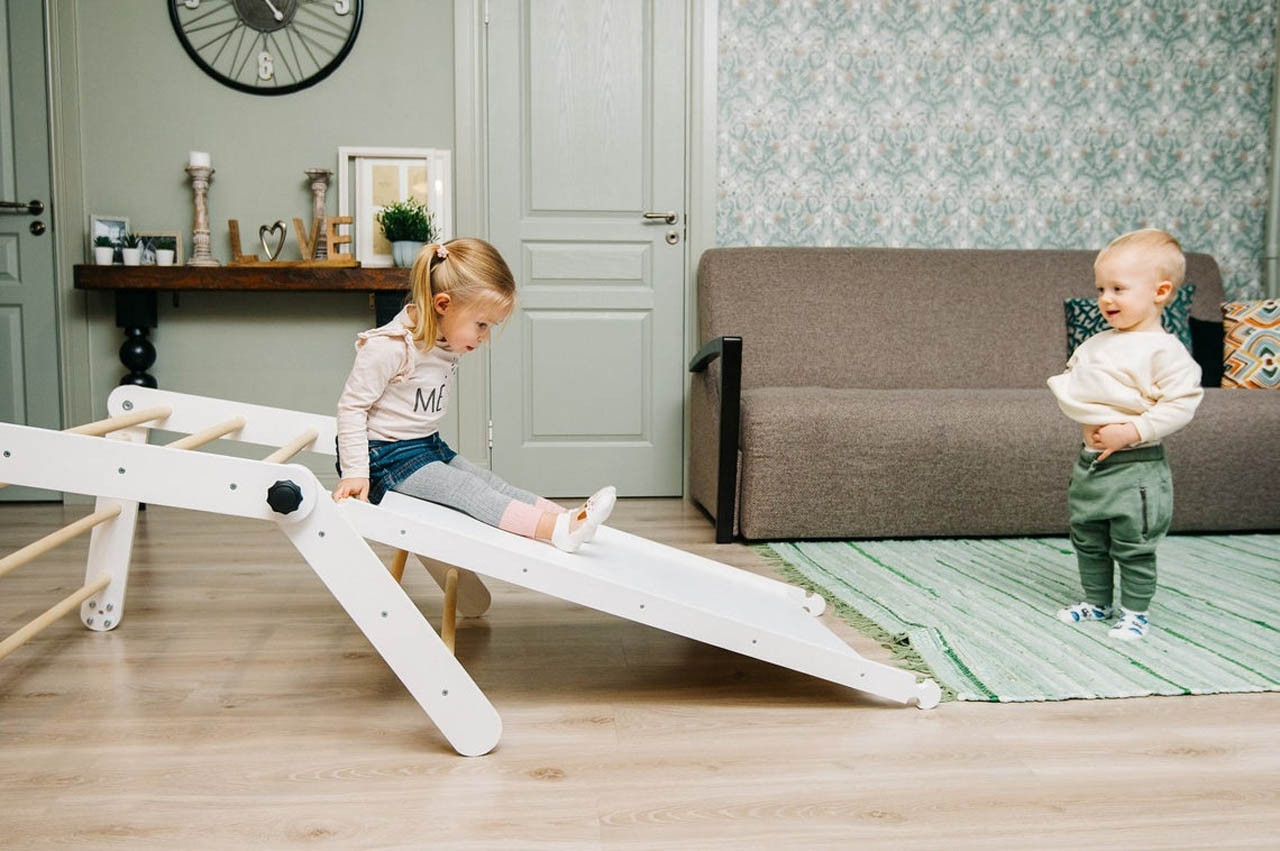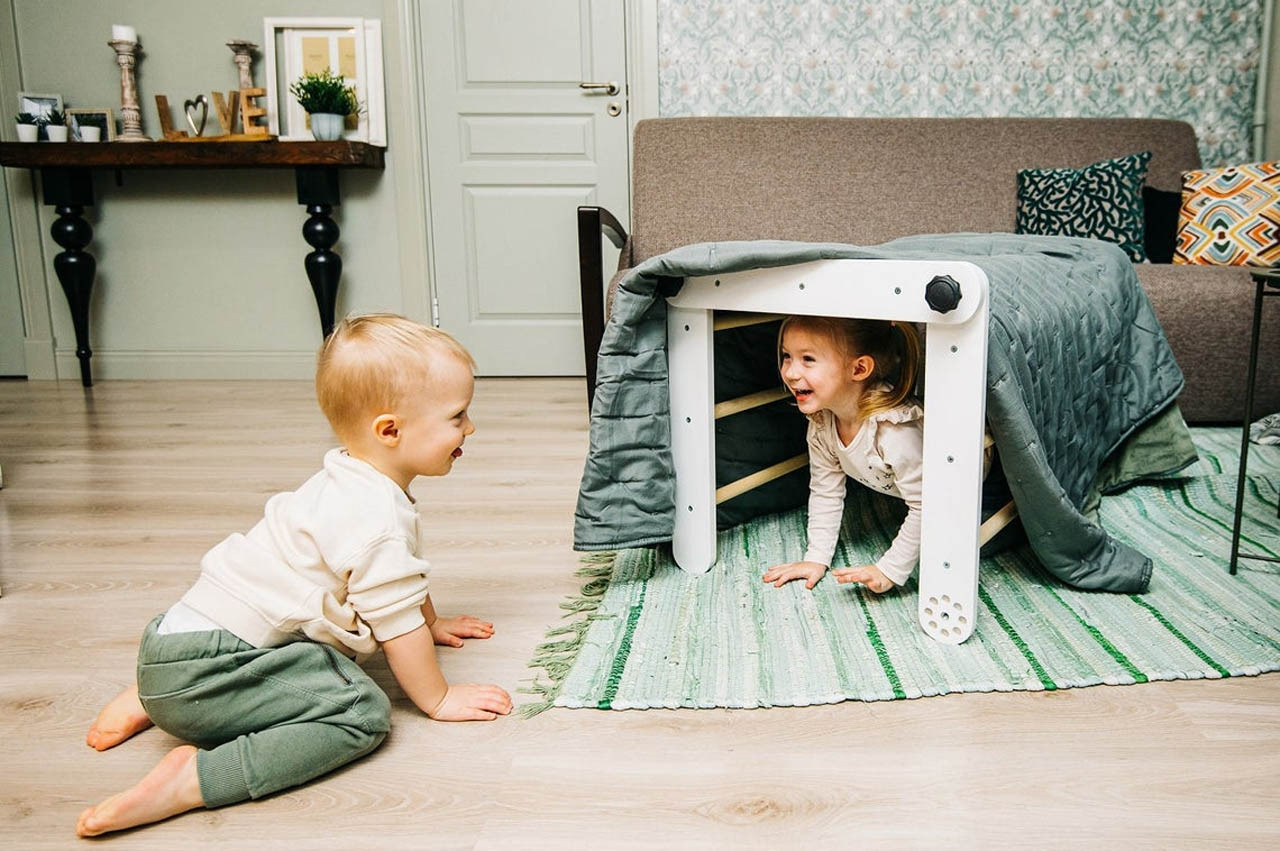 Montessori trikotnik lahko uporabite na 4 različne načine. Otrokom je vedno zanimiv, saj imajo pri vsaki postavitvi možnost razviti različne motorične sposobnosti, raziskovati in se igrati na različne načine. Otrok se lahko skrije pod trikotnik, po njem pleza, se obeša ali spušča.