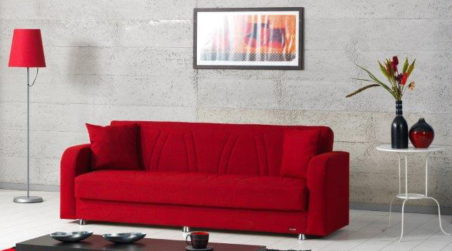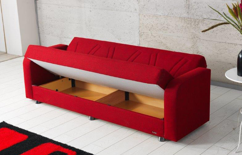Multifunkcijski kavč Joker je na voljo v rdeči barvi. Kavč je izjemno praktičen saj se z enostavnim klikom spreminja v dodatno ležišče, ima pa tudi zaboj za shranjevanje.