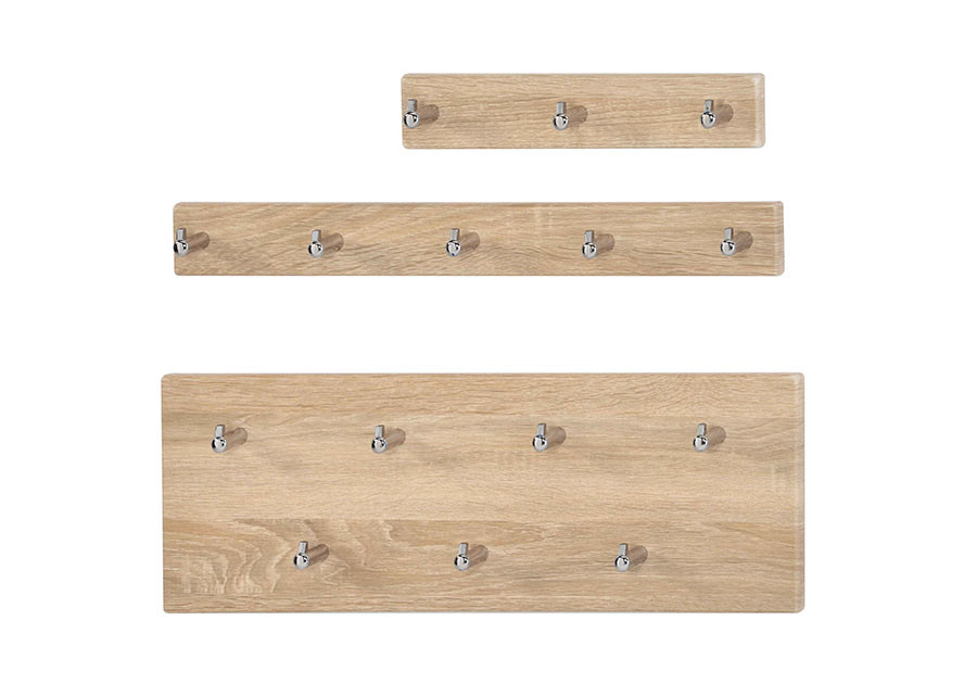 Obešalnik JAN 3 je stenski obešalnik iz mediapana s sedmimi kljukicami v sonoma hrast barvi - brušen. Kljukice so kromirane.