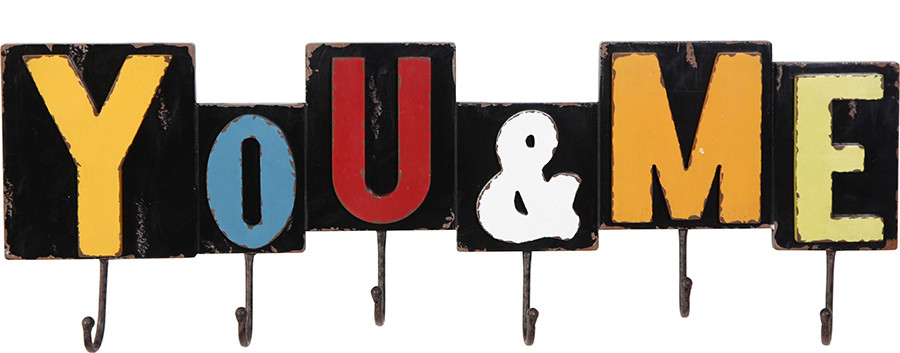 Obešalnik YOU&ME je stenski obešalnik z napisom "you and me". Opremljen je z 6 kovinskimi kljukicami. Ta duhovit in zanimiv obešalnik je priročna dopolnitev v vsakem gospodinjstvu. Na praktične kljukice boste lahko obesili svoje stvari in predsoba bo vedno urejena. Največja obremenjenost je 8 kg.