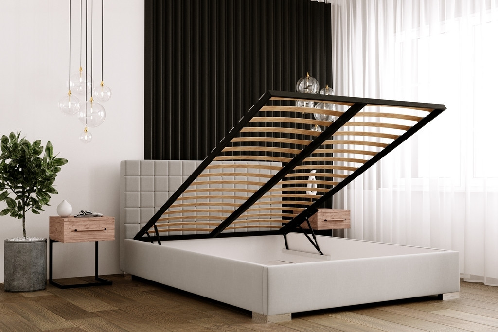 Oblazinjena postelja BARETTA ima dvižni mehanizem, ki se z lahkoto uporablja in vam nudi izkoristek celotnega prostora pod posteljo za shranjevanje posteljnine, letnih oblačil, vzglavnikov in odej ter ostalih poljubnih predmetov. Vaše omare bodo zato ostale lepo urejene in ne bodo prenatrpane. Predal pod posteljo je razdeljen na dva dela in je visok približno 14 cm.